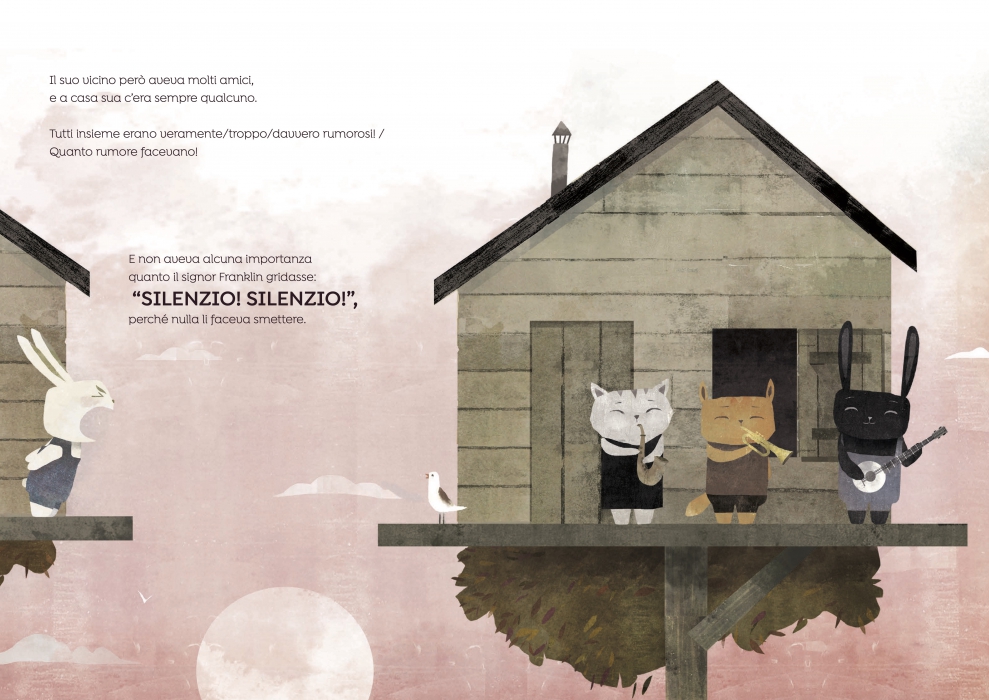 un fastidioso viavai che il signor Franklin proprio non tollera: “SILENZIO!†urla in continuazione. Anche quando un enorme gabbiano si posa sul tetto e inizia a cantare a squarciagola, il signor