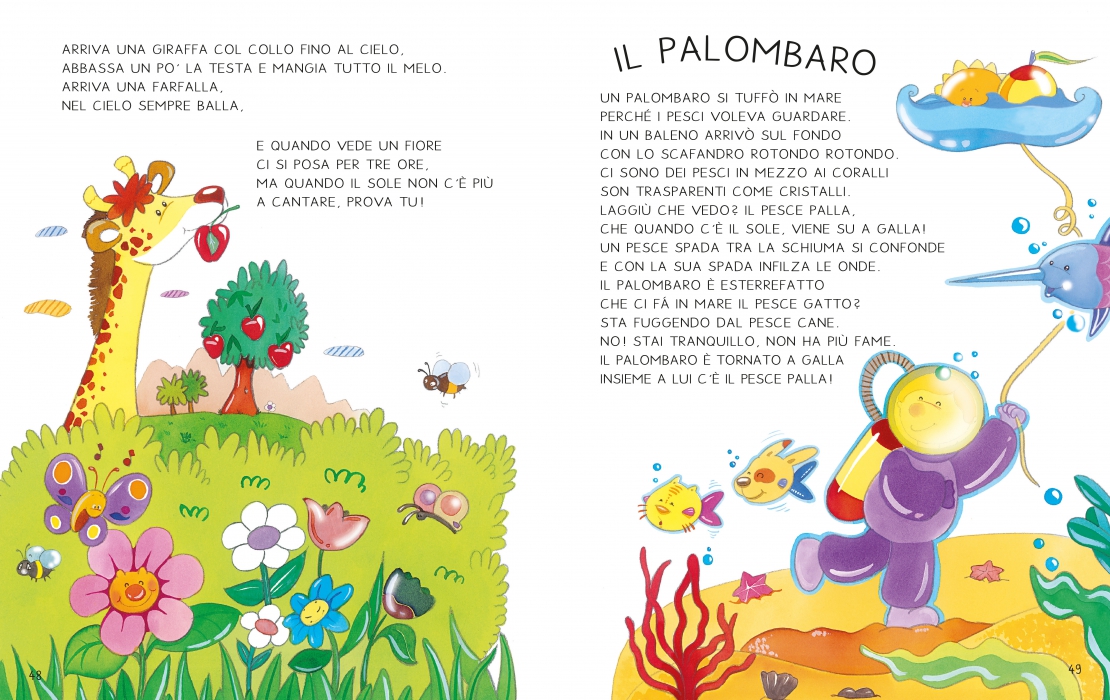 ContenutoQuesto è il libro divertente, pazzo sciocco e intelligente, puoi trovarci il bello e il brutto, non c’è niente e c’è di tutto. Se tu leggerlo vorrai, tante cose scoprirai, i racconti di altri mondi, filastrocche e girotondi.